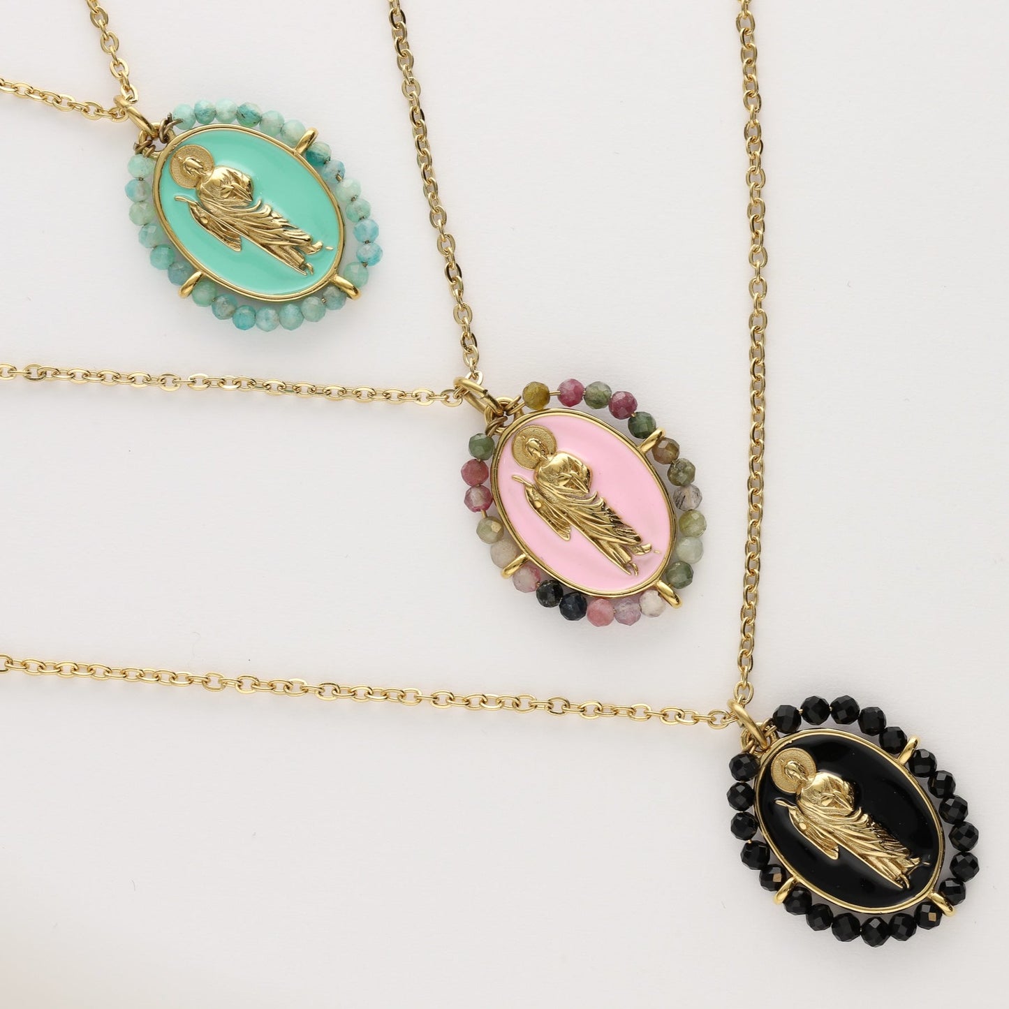Cada colgante está hecho artesanalmente en España, con piedras naturales seleccionadas y medalla de San Judas Tadeo. Su cadena ajustable de 40 a 45 cm con cierre mosquetón permite adaptarlo a cualquier estilo y ocasión.