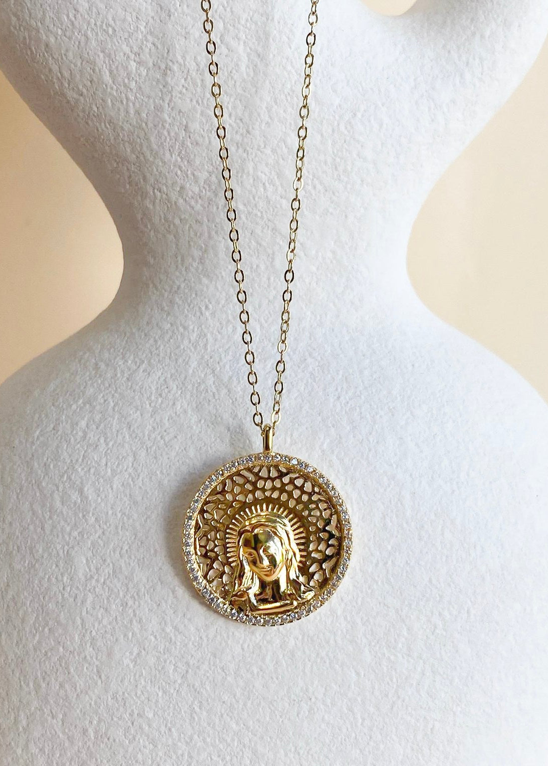 Descubre la Medalla de la Virgen María de Bendita Eva, una joya llena con un significado muy especial. Este colgante, fabricado en plata de ley y bañado en oro de 18K, tiene una medalla de 22 mm con la imagen grabada de la Virgen María símbolo de protección maternal y amor. La pieza está adornada en su esfera con circonitas de 1 mm que le aportan un brillo delicado y elegante. Incluye una cadena de 44 cm con un alargador de 5 cm, permitiendo ajustarse a cualquier medida.