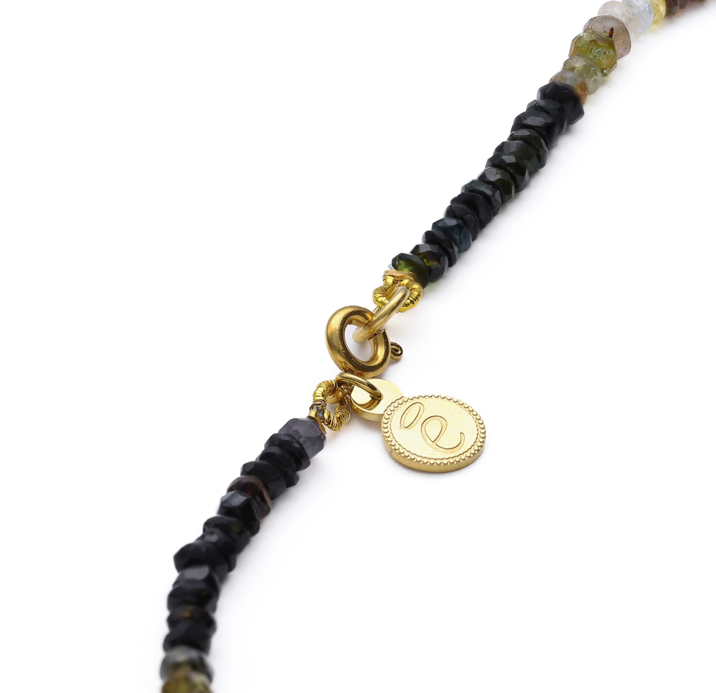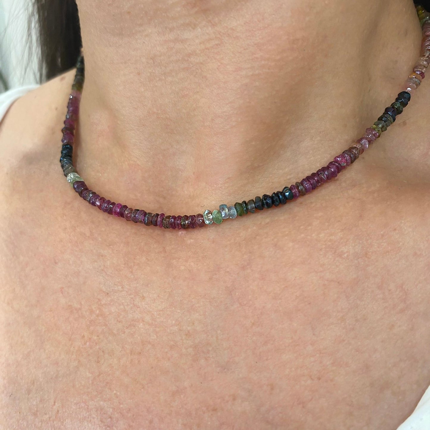 El collar de turmalina multicolor de Bendita Eva es una joya artesanal enfilada a mano en España, creada con turmalinas naturales de 4 mm que forman un elegante degradé de colores, desde verdes intensos y rosas suaves hasta negros profundos.