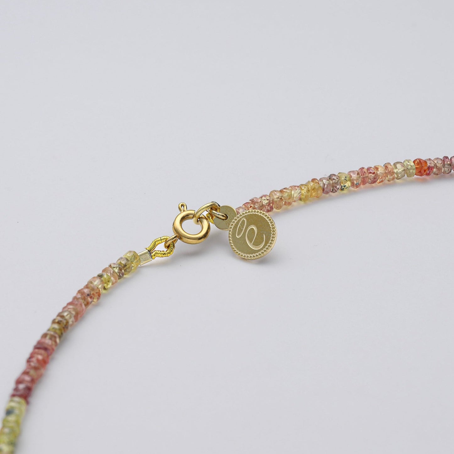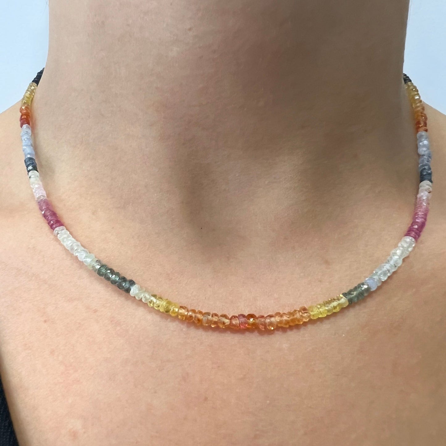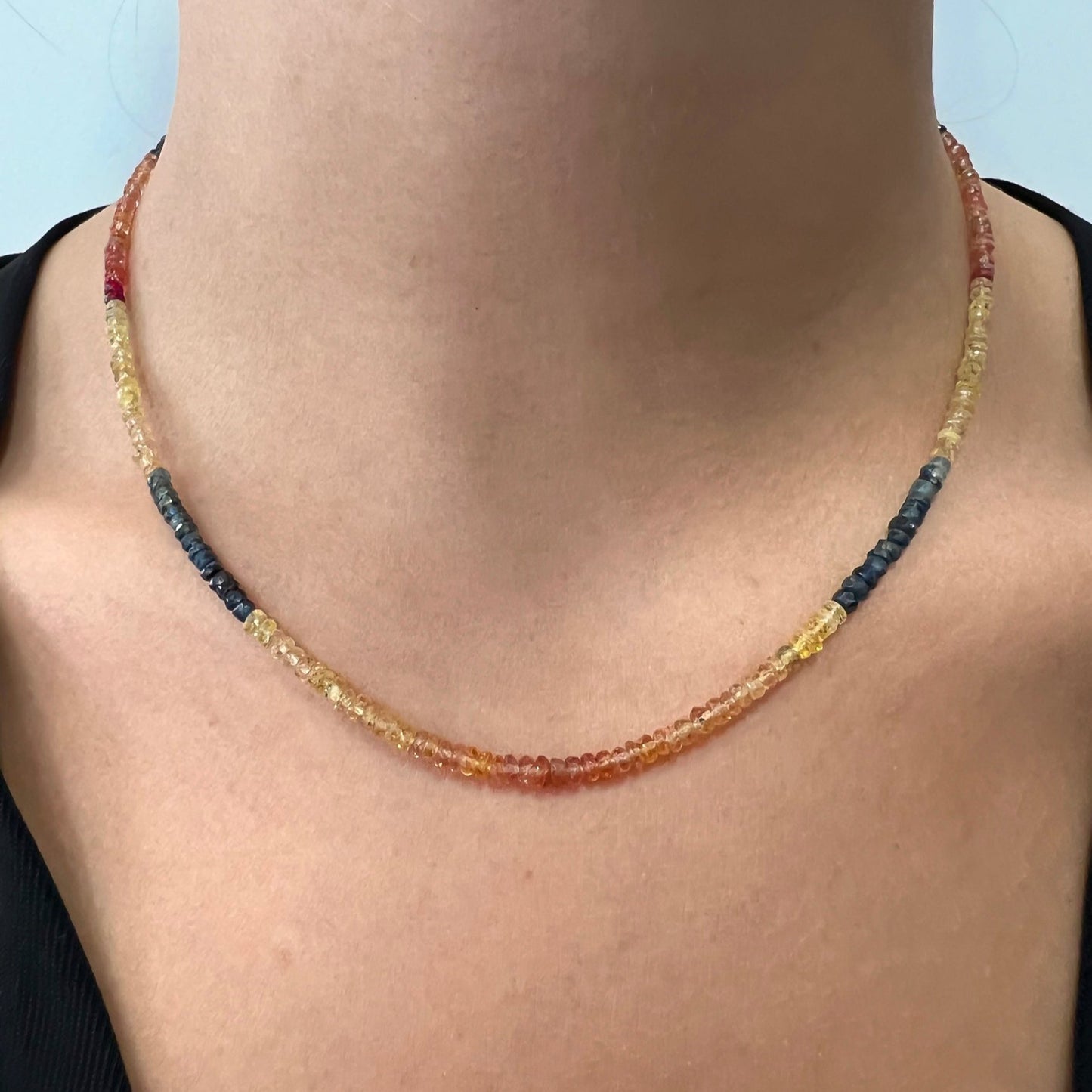 El Collar de Zafiros Multicolor de Bendita Eva está elaborado artesanalmente en España, con zafiros naturales de 4 mm cuidadosamente seleccionados, en una vibrante gama de colores que va del azul intenso al rosa y violeta suaves. Cada piedra ha sido enfilada a mano, creando un degradé elegante y exclusivo que convierte este collar en una pieza irrepetible.