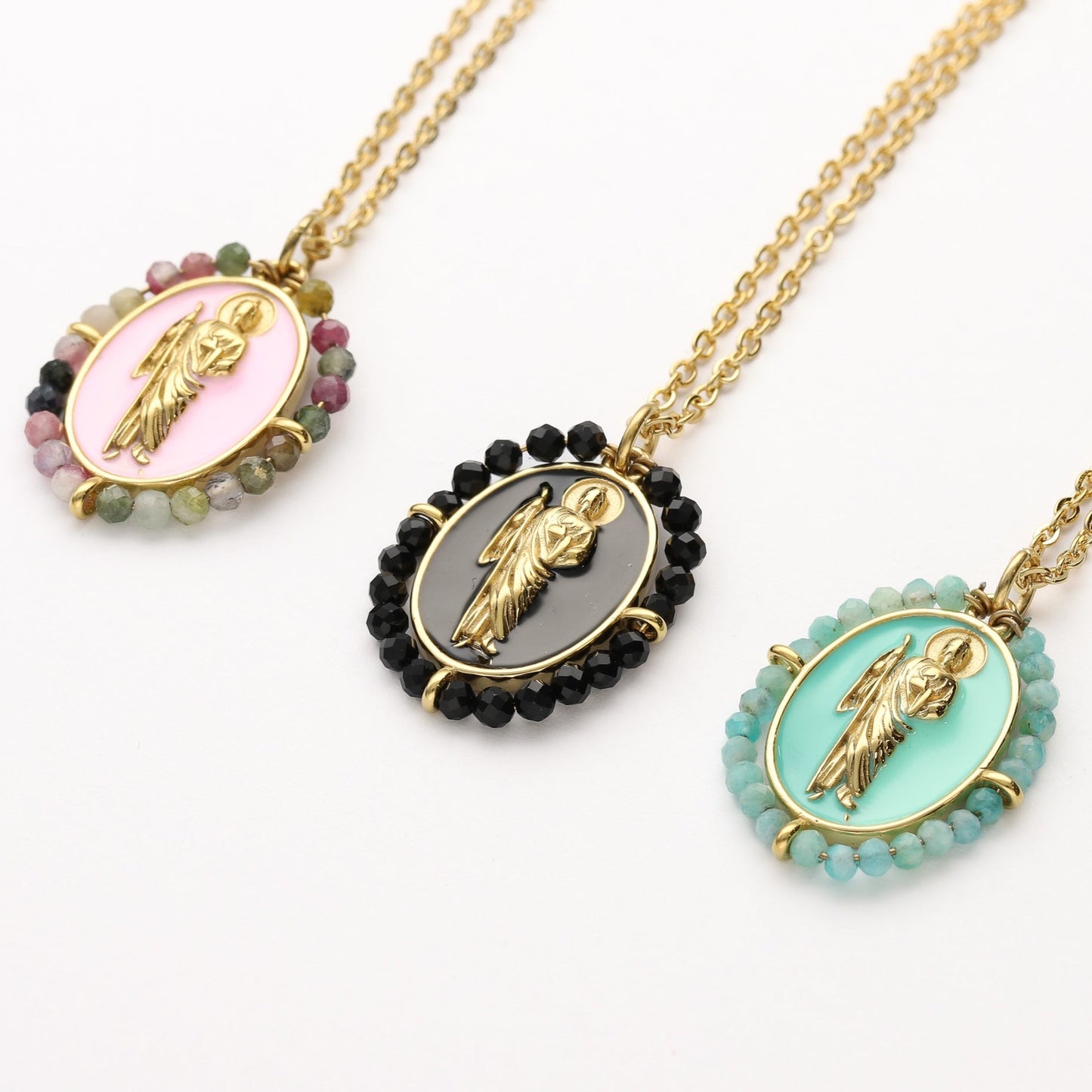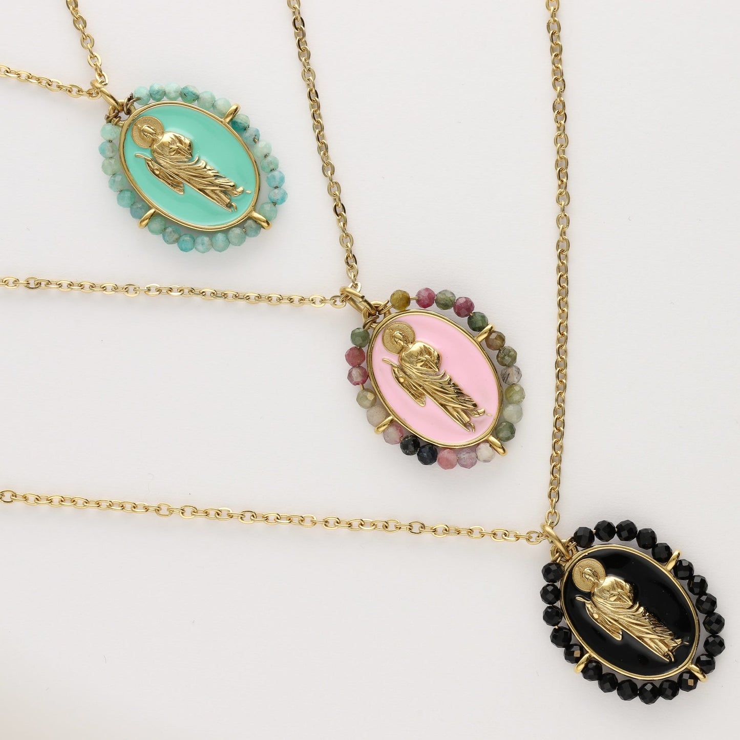 Cada colgante está hecho artesanalmente en España, con piedras de 2,5 mm y una medalla de San Judas Tadeo. Su cadena ajustable de 40 a 45 cm con cierre mosquetón asegura comodidad y versatilidad para cualquier ocasión.