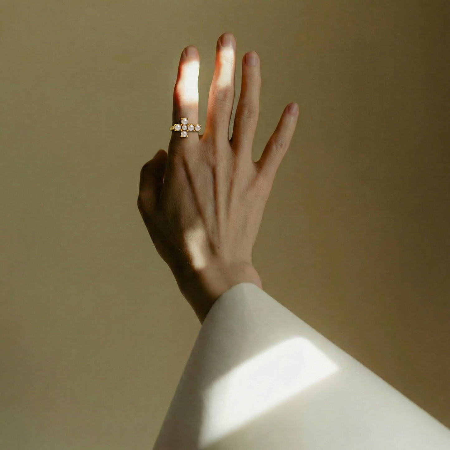 Conoce nuestro anillo cruz de perlas naturales, una joya atemporal fabricada artesanalmente en España en plata de ley 925 con baño de oro de 18K de 2 micras.