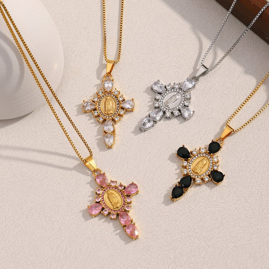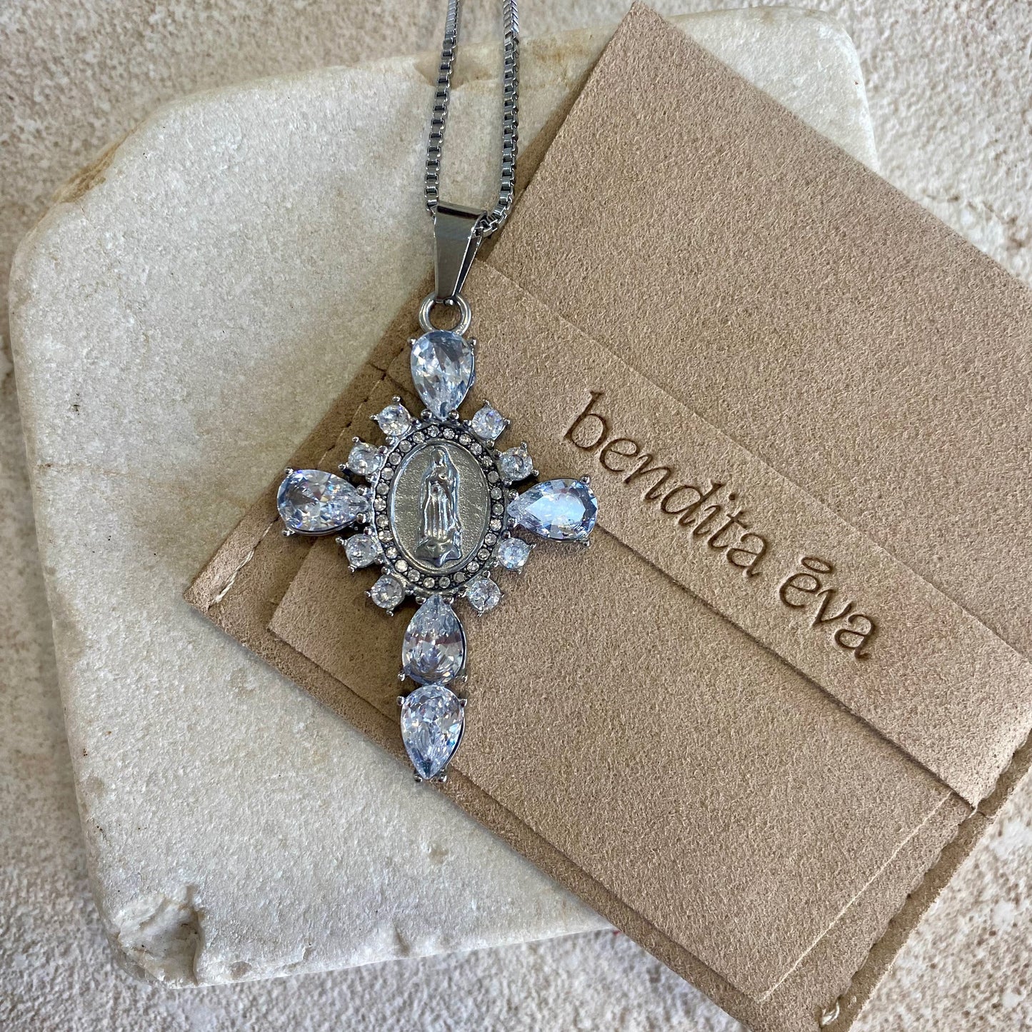 El colgante Cruz Circonitas blancas reinventa un símbolo atemporal con un giro actual. Su diseño con circonitas blancas de 2,5 mm y la virgen grabada en el centro de la cruz aporta luz, fuerza y un estilo que no pasa desapercibido.
